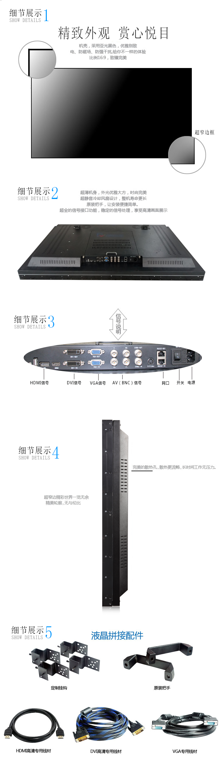 65寸液晶拼接單元采用原裝三星DID液晶拼接屏,雙邊拼縫3.5mm,采用4K高分辨率(3840×2160)、高亮度(700cd/m2)、高對比度(4000:1)、寬視角(178度)的高清LED顯示面板,支持1080P全高清數(shù)字視頻顯示。